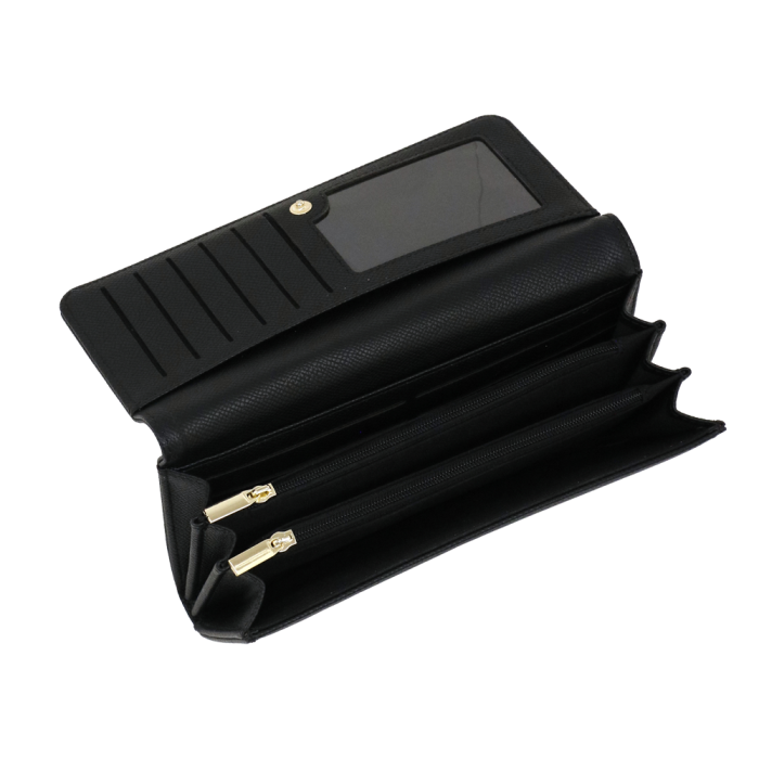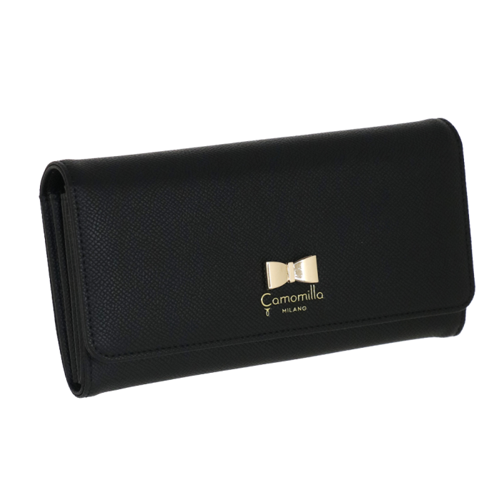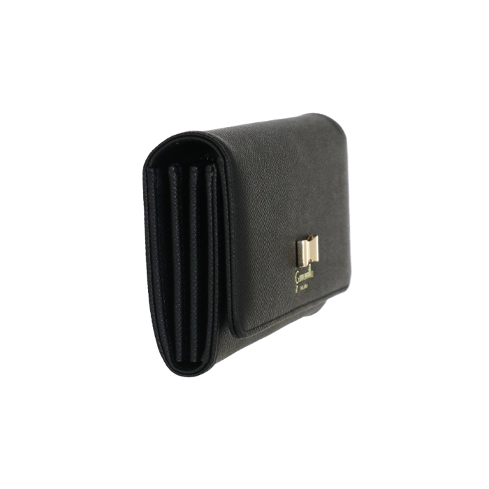 PORTAFOGLIO L NICE OFFICE NERO, comodo e capiente, realizzato in un particolare saffiano martellato. Collezione sviluppata in quattro varianti colori, rosso, nero, taupe e rosa cipria. Personalizzato con fiocco in metallo e stampa a rilievo del logo color oro. Organizzazione interna con sei slot per carte, tre scomparti per banconote, una tasca piatta grande e due tasche con chiusura zip. Esternamente è impreziosita dal logo a rilievo colore oro. Dal design pulito e ricercato, il fiocco in metallo dona un tocco di eleganza e romanticismo