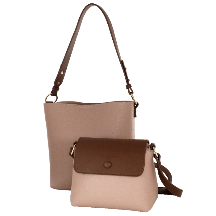 BAG IN BAG M BREE Borsa realizzata in finta pelle martellata, con rifiniture in pelle sintetica liscia. Una seconda borsa più piccola al suo interno è coordinata. La tendenza del momento consiste nell'indossare due borse insieme: una più grande, che costituisce la main bag e una borsa più piccola indossata a tracolla, la second bag. Questa combinazione di accessori rappresenta uno stile unico e contemporaneo, permettendo inoltre di avere più spazio per portare con sé qualcosa di più dei cosiddetti indispensabili. I colori dai toni autunnali, beige, verde, rosa antico e nero, vengono contrastati da dettagli in PU effetto cuoio. SET COMPOSTO DA DUE BORSE