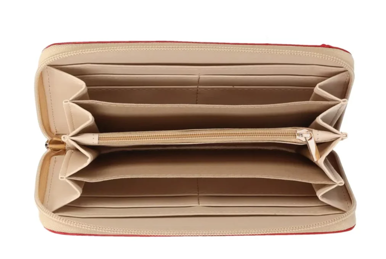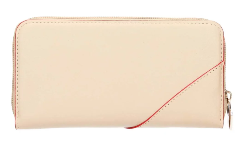 Portafoglio donna della linea love to love  con apertura con zip diviso in più scomparti mentre centrale si trova il portamonete con zip e sui lati sono predisposti gli scomparti portacarte.
