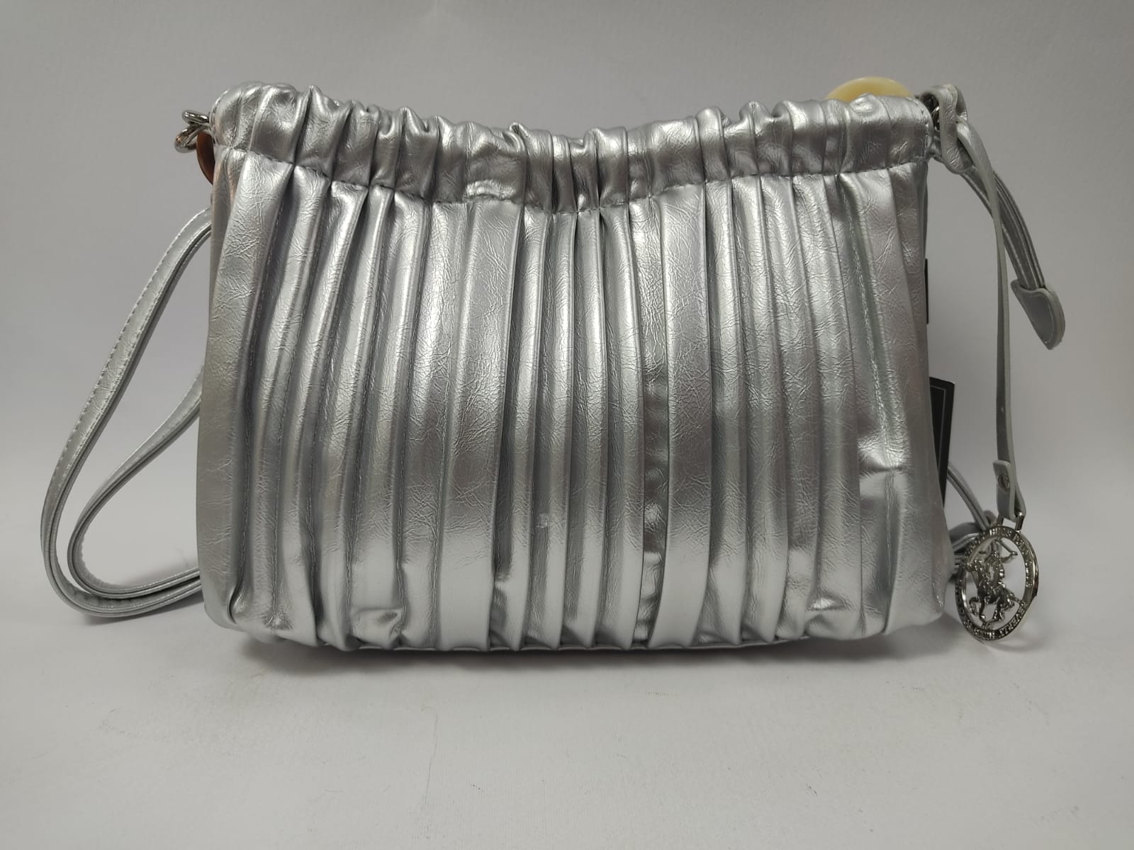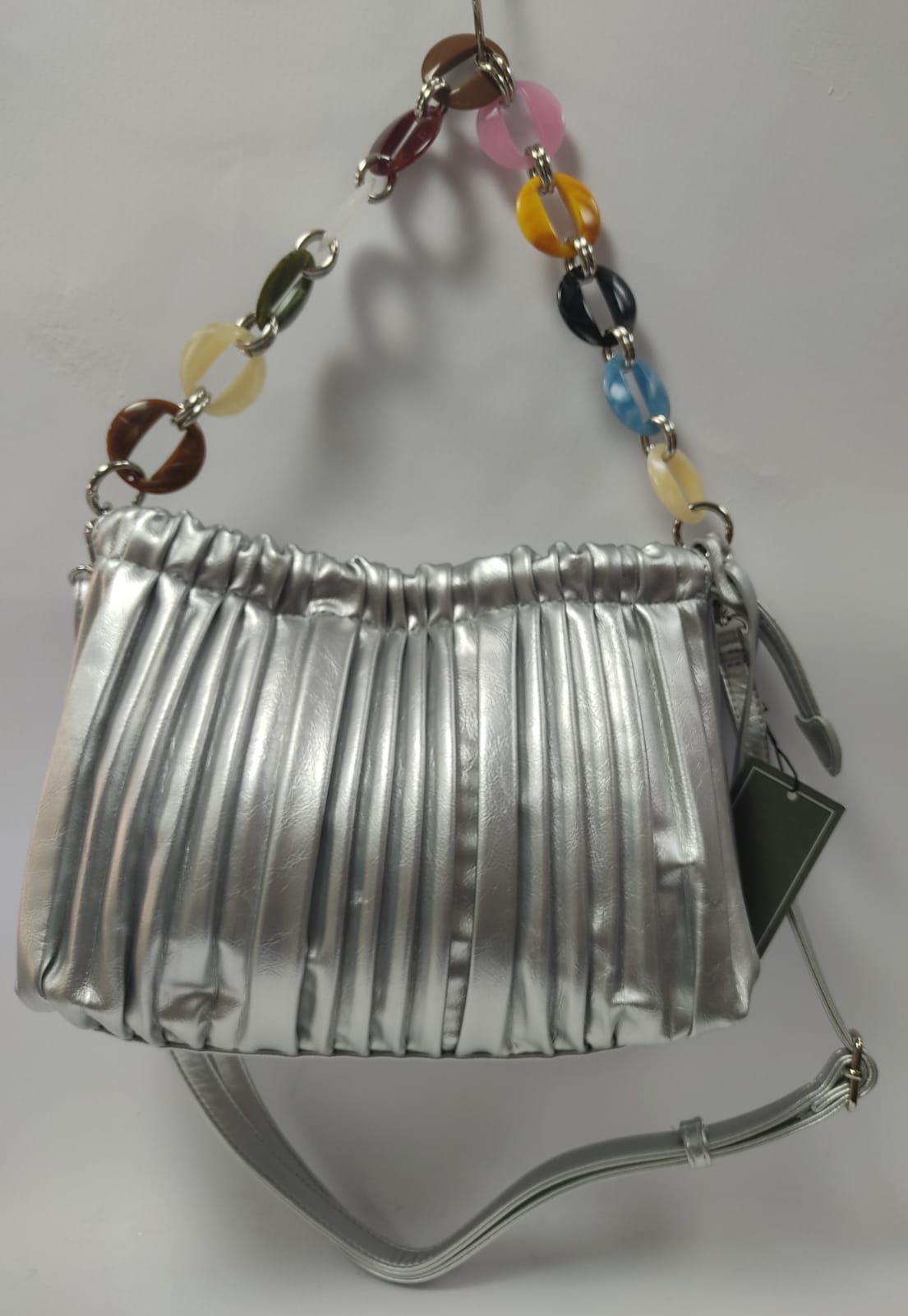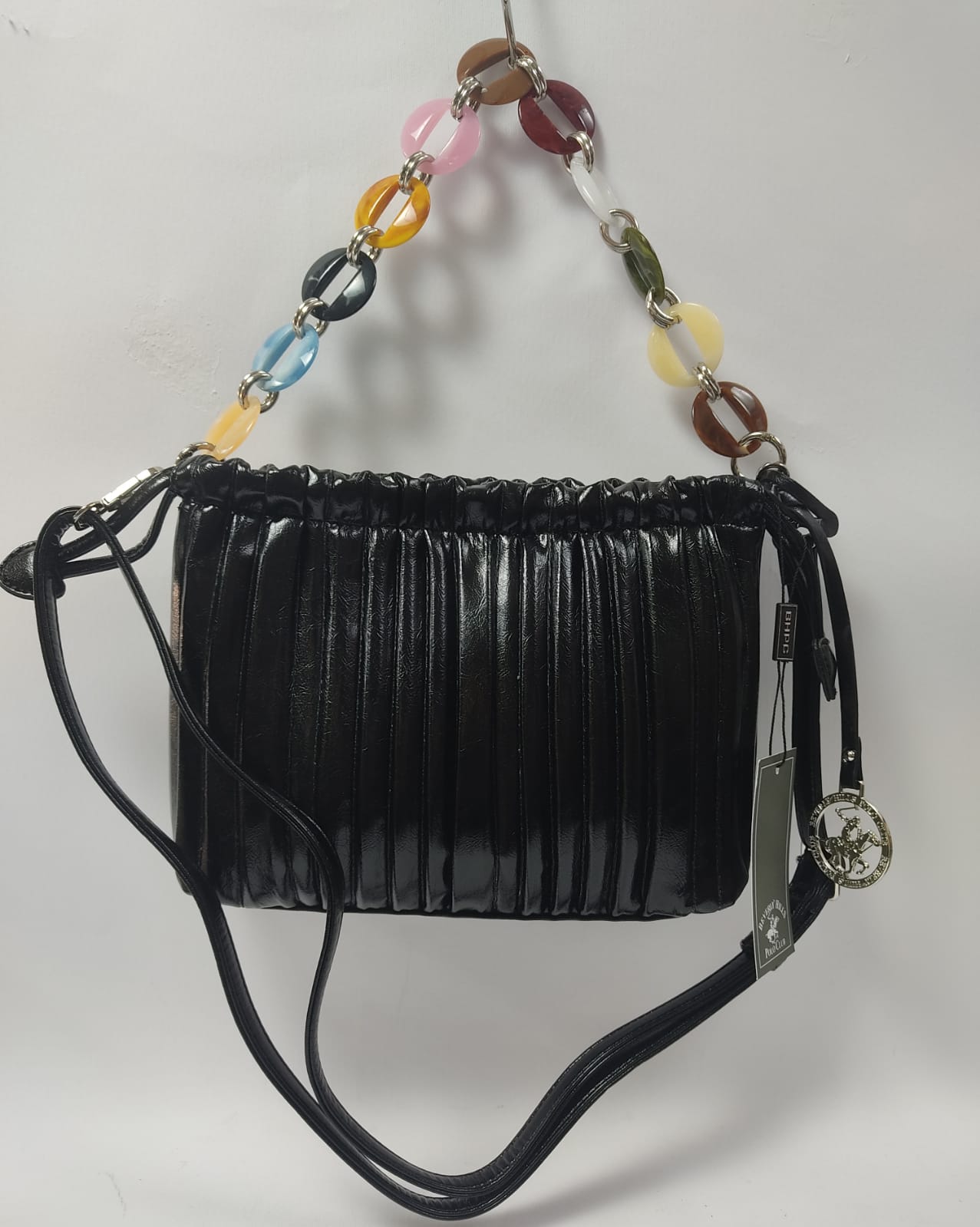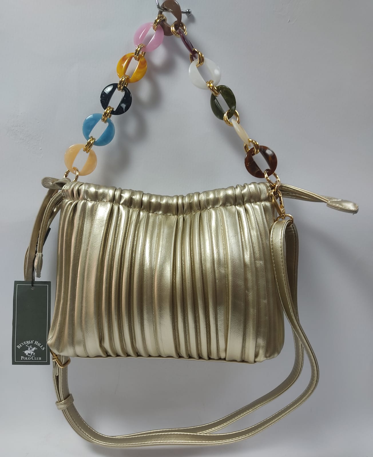 Borsa shopping della linea di beverly hills polo club, apertura a clip senza zip, tinta unita ma tessuto striato, come accessorio è presente una catenina milticolor che può essere utilizzata come tracolla per poter portare la borsa a spalla, ma è presente anche una tracolla lunga regolabile.