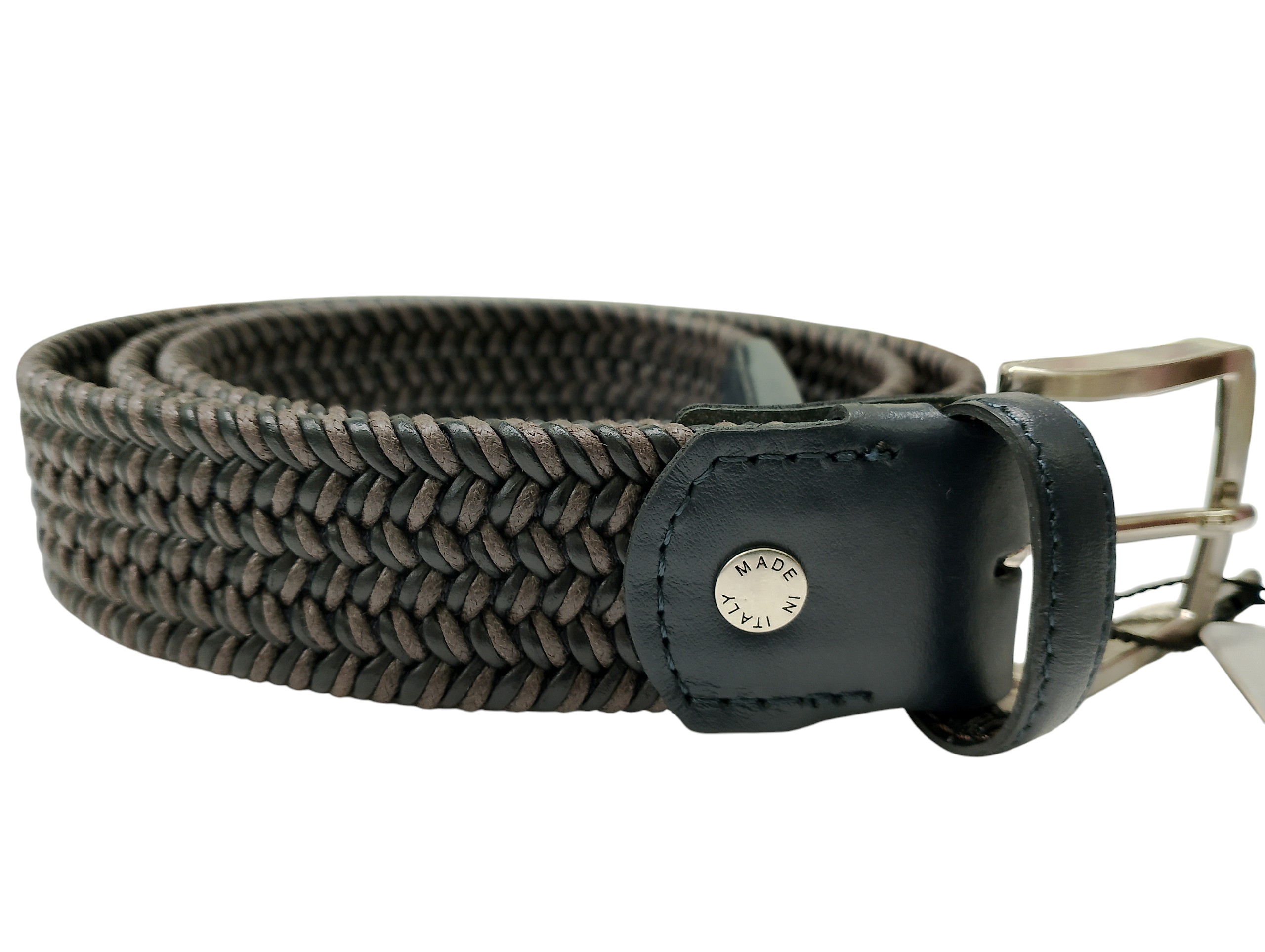 Cintura uomo Valentino in vera pelle intrecciata in colore marrone e blu scuro.