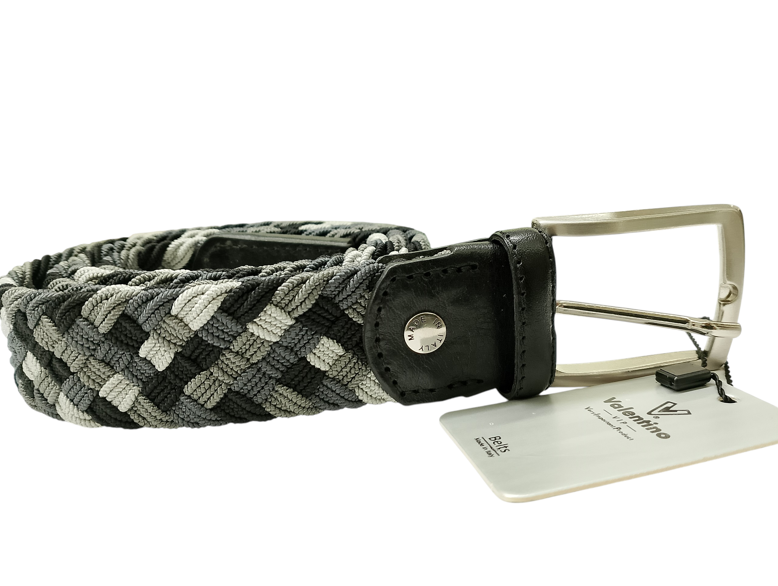 Cintura uomo Valentino in vera pelle intrecciata in nuance nera,grigio scuro e grigio chiara.