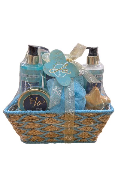 Confezione regalo le fate di jo cesta riutilizzabile con : gel doccia da 200ml , crema mani 120ml , spugna da bagno, lozione corpo 200ml , scrub corpo 50ml , bomba da bagno 50g