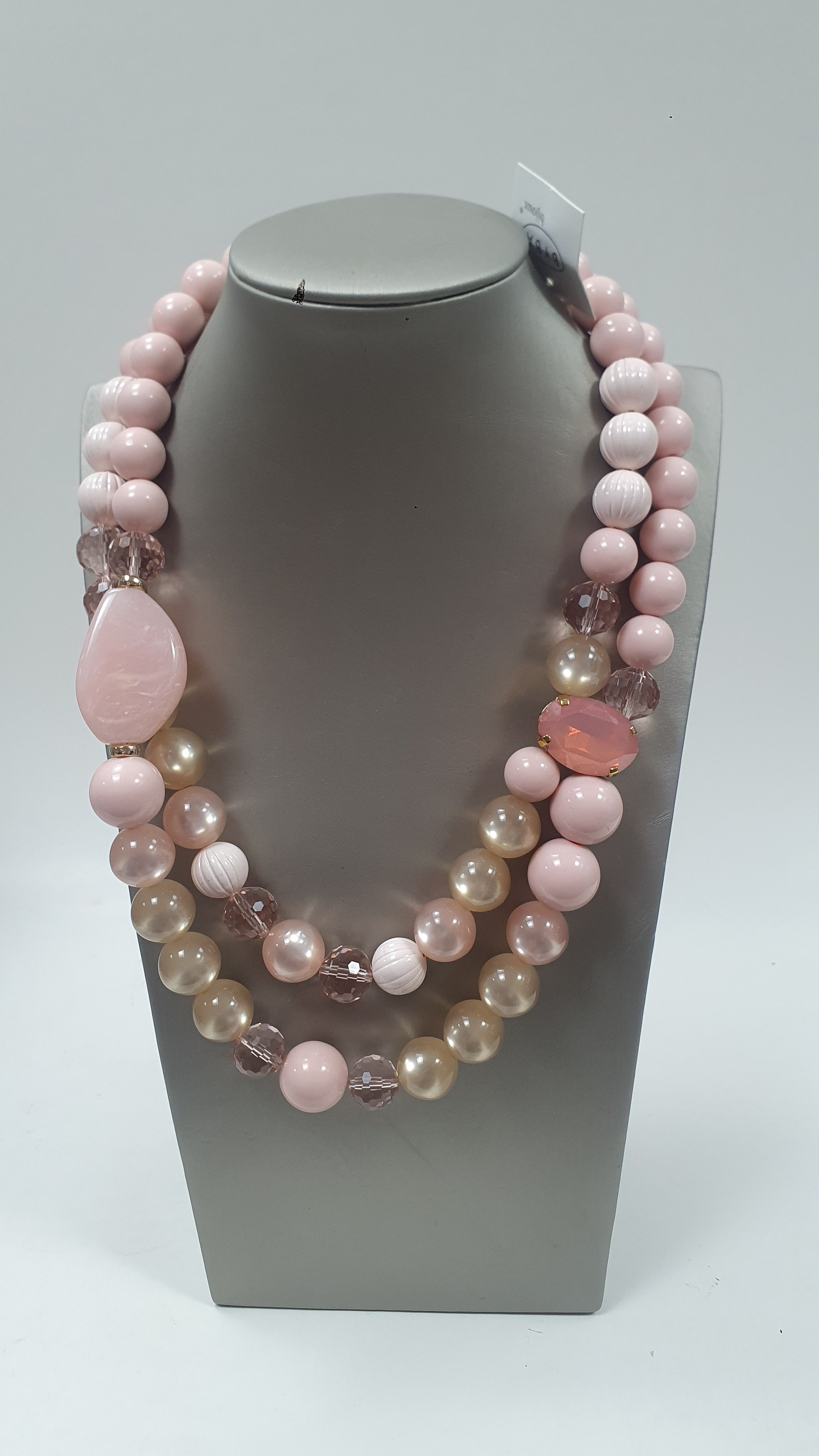 Collana doppio giro con chiusura con gancio, lunghezza media con perle color rosa delicato.