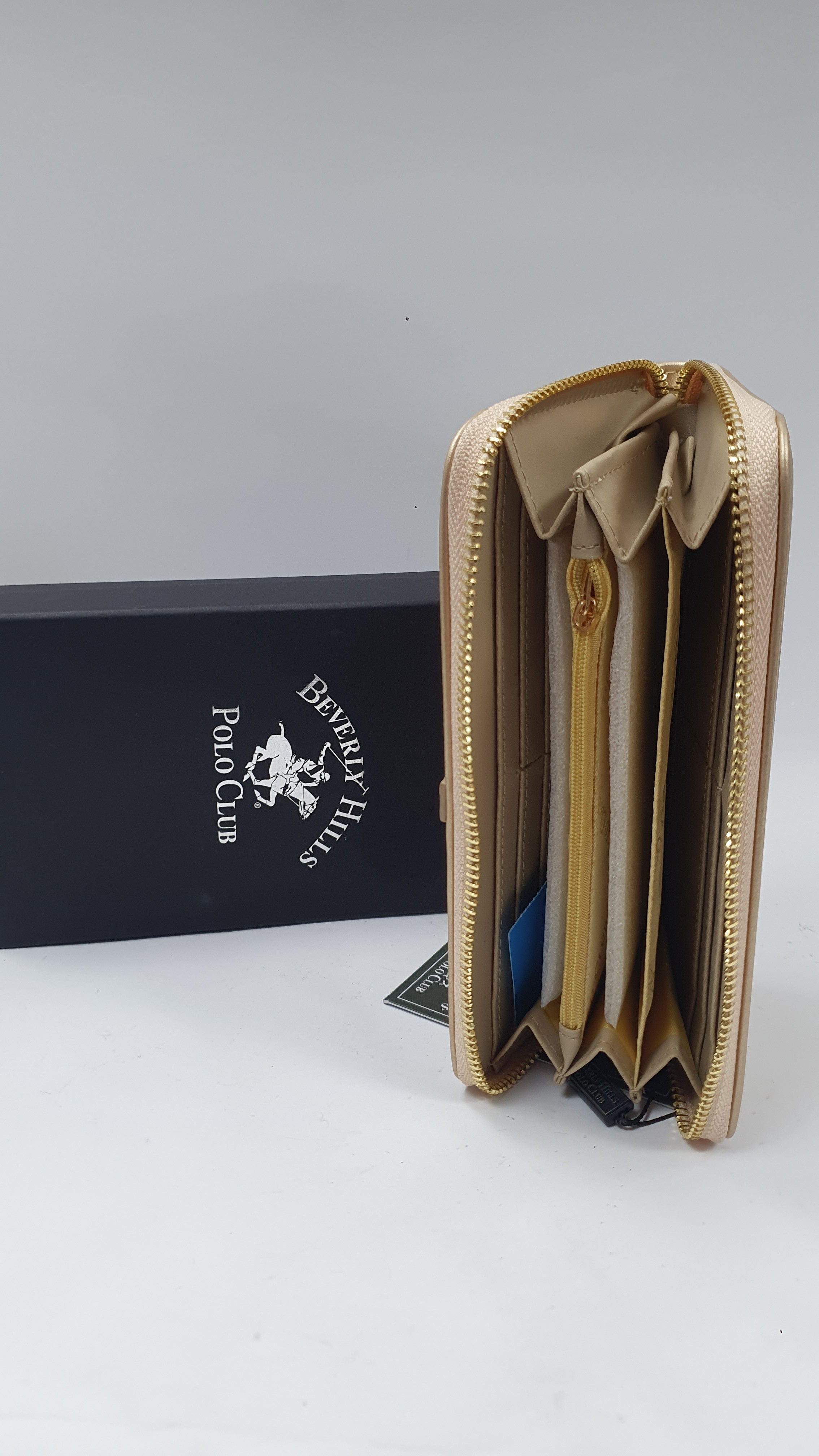 Portafoglio donna di beverly hills polo club con apertura con zip centrale, design liscio a tinta unita ma centrale è posta una finta cintura come ornamento. Al suo interno troviamo due scomparti divisi per le banconote e al centro troviamo il portamonete con chiusura a zip. Ai lati troviamo gli scomparti portacarte.