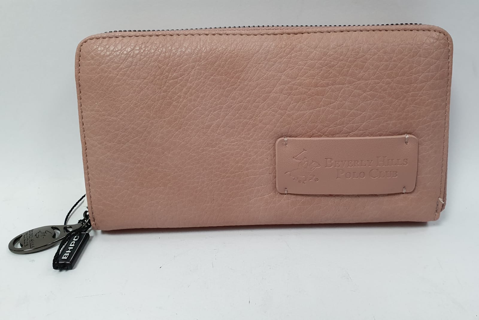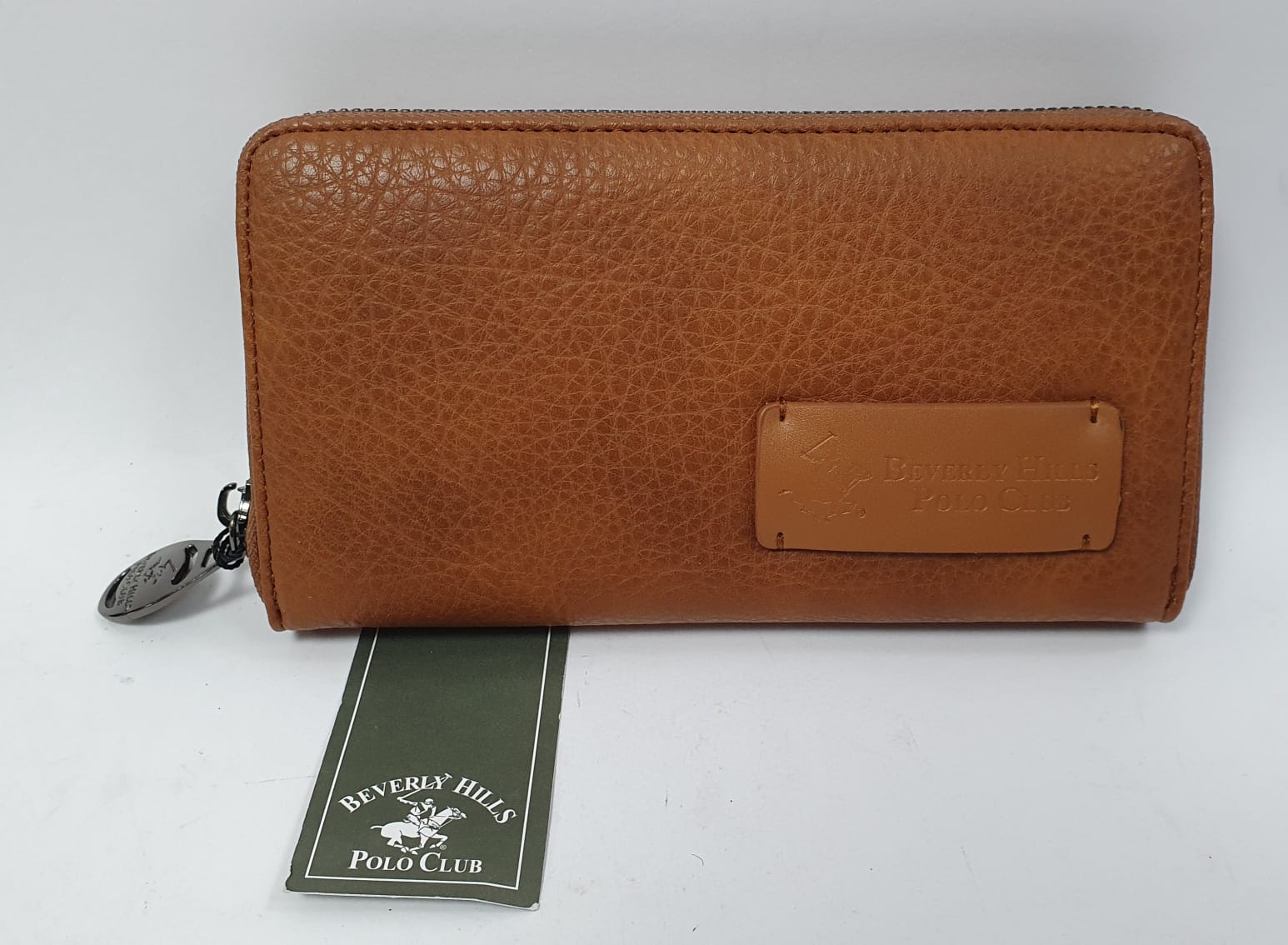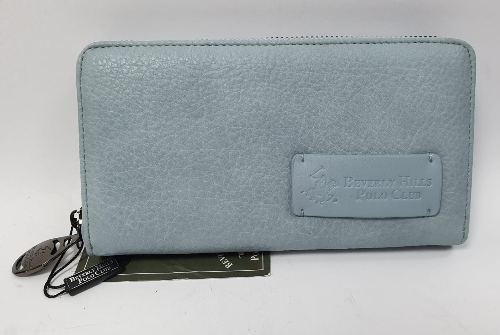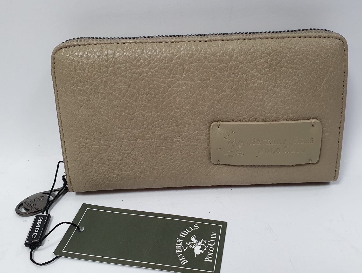 Portafoglio donna della linea di Beverly hills polo club, stile martellato con una piccola placchetta sempre in ecopelle cucita con la stampa dell'azienda. apertura con una zip centrale e al suo interno ci sono posizionati lateralmente gli scomparti per le carte di credito e due scomparti per i contanti mentre...