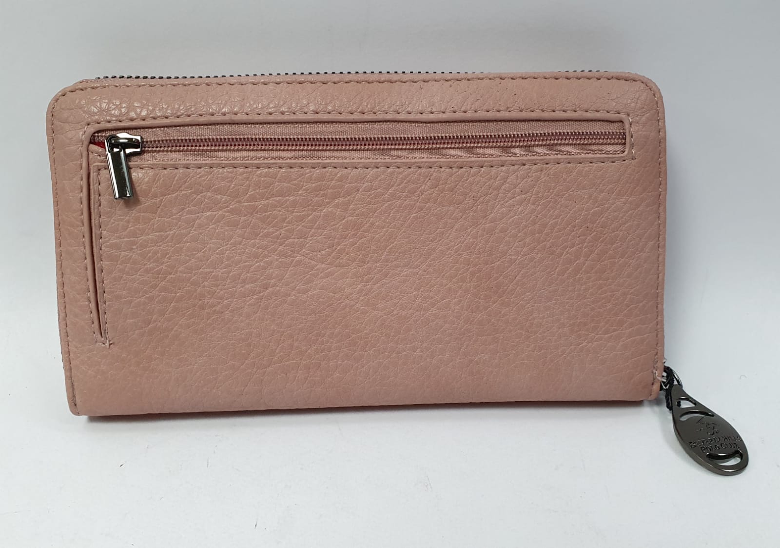 Portafoglio donna della linea di Beverly hills polo club, stile martellato con una piccola placchetta sempre in ecopelle cucita con la stampa dell'azienda. apertura con una zip centrale e al suo interno ci sono posizionati lateralmente gli scomparti per le carte di credito e due scomparti per i contanti mentre centrale è posizionata una tasca con zip per le monete. mentre dietro è presente una piccola zip