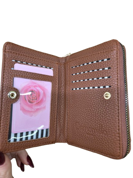Portafoglio donna di medie dimensioni con doppia apertura , da un lato con bottoncino troviamo portafoto, e portacarte con lo scomparto per le banconote. Mentre il lato con la chiusura zip troviamo due scomparti per banconote e centrale il portamonete