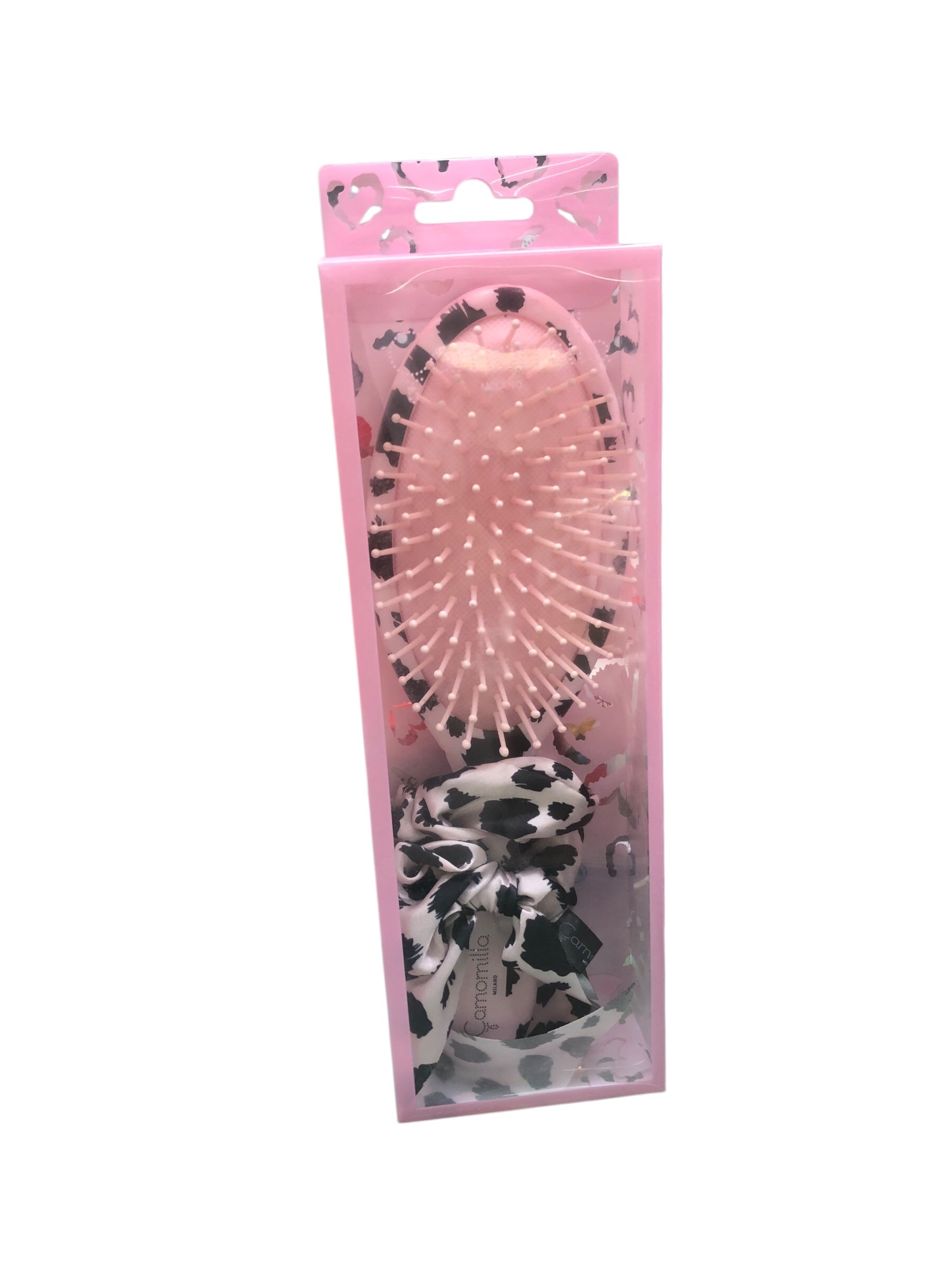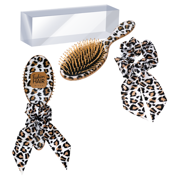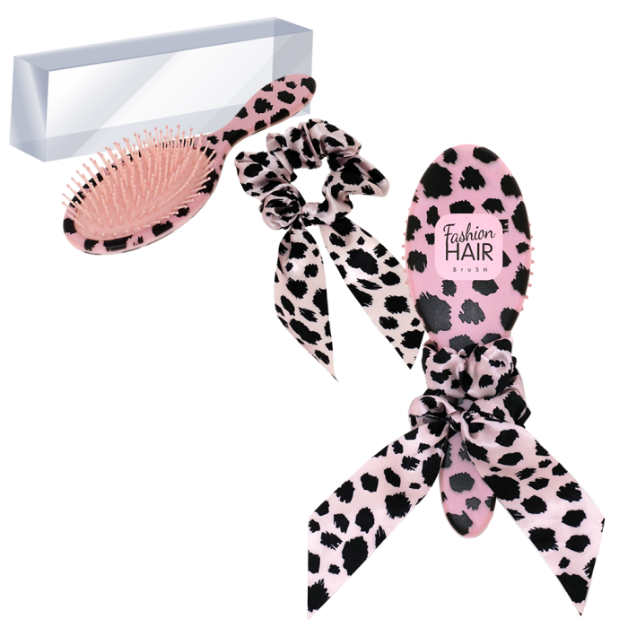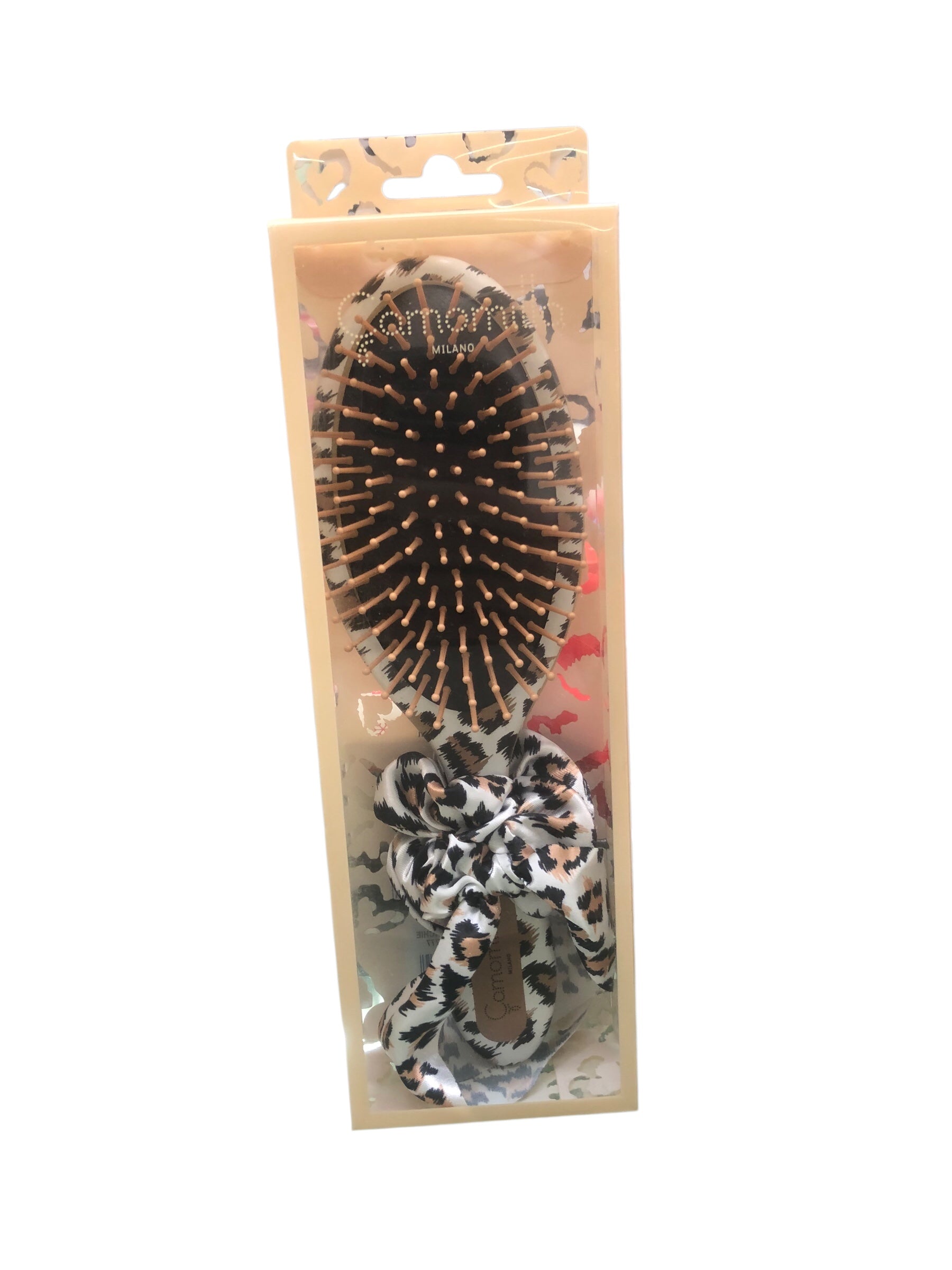 SET SPAZZOLA CON SCRUNCHIE LEOPARD include una spazzola ovale con stampa leopardata elegante ma ruggente, perfetta per districare con grinta ogni tipo di capello ed uno scrunchie coordinato, morbido e voluminoso, per code di cavallo da passerella o messy bun da gatta con stile!Un duo inseparabile, perfetto per borsetta, palestra o come idea regalo graffiante per amiche con una personalità da vere feline fashion.